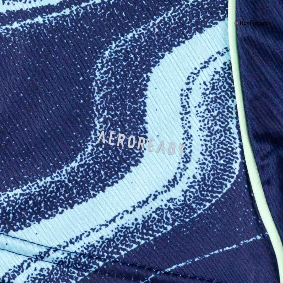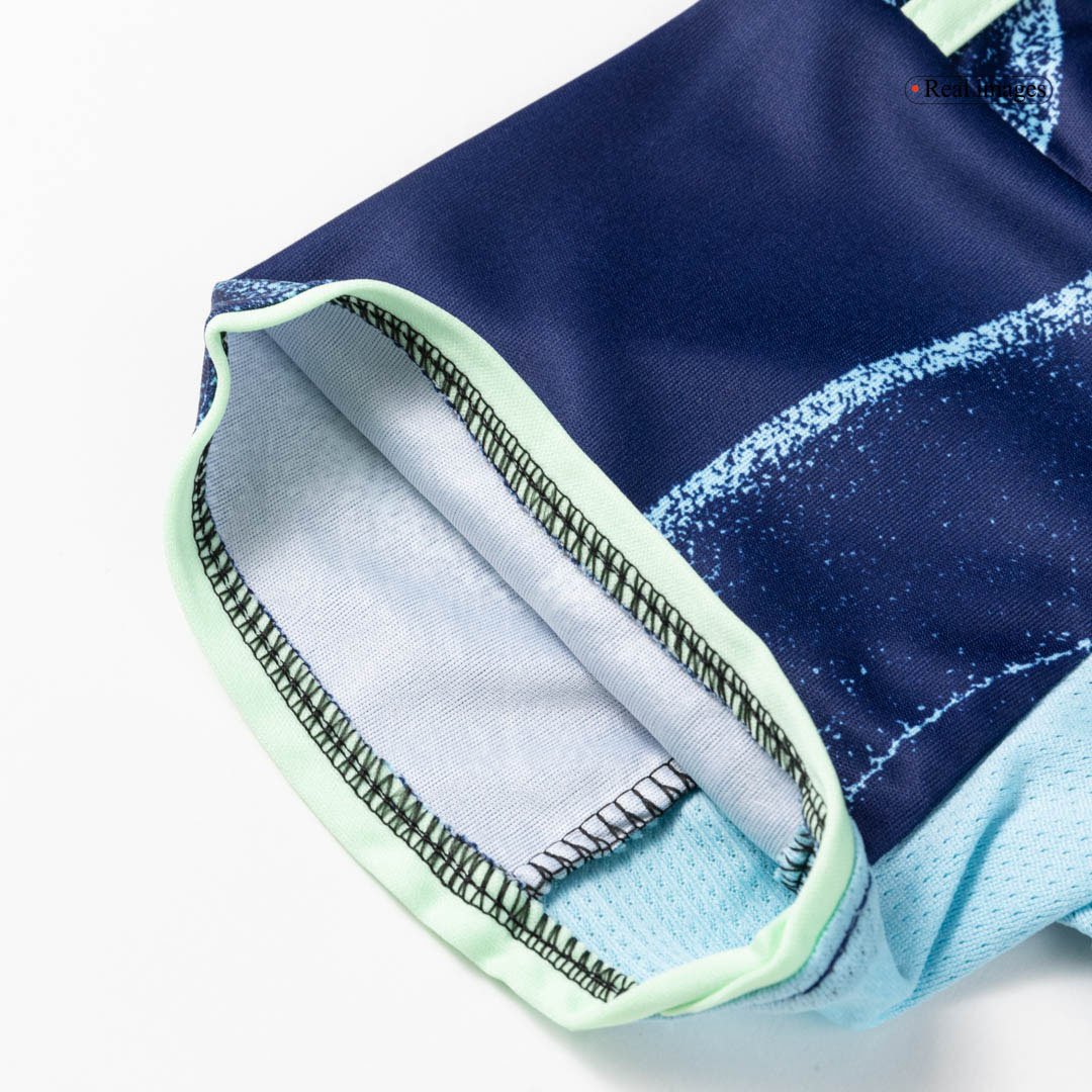 The Ajax Away Kids Soccer Jerseys Kit 2025/26 celebrates the city's long tradition of nurturing world-class talent. Paying tribute to the belief that skill and creativity are "in our water," this kit is designed for the next generation of Ajax fans. The base color "Night Sky" is complemented by dynamic, wavy blue graphics with a marbled effect, while bright fluo green logos and sky-blue accents add a striking contrast. For the first time in club history, the jersey features a recolored monochrome Ajax crest, giving young fans a fresh yet authentic look.
