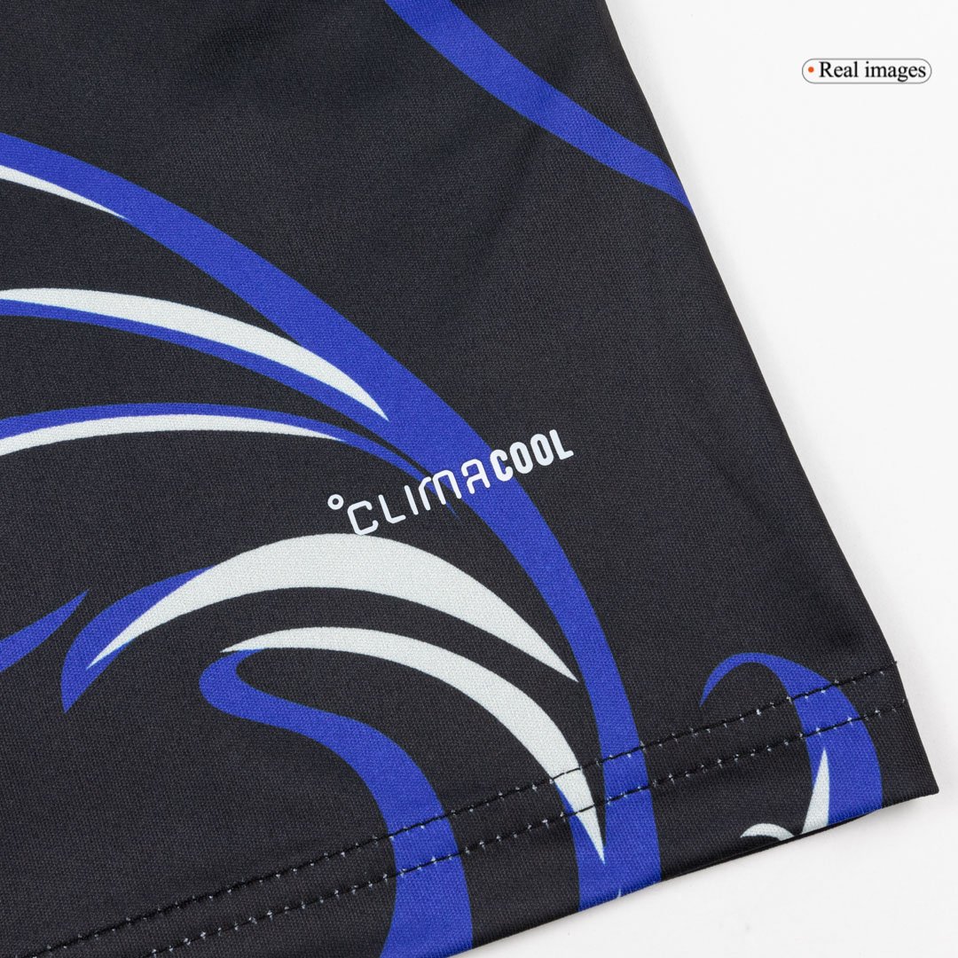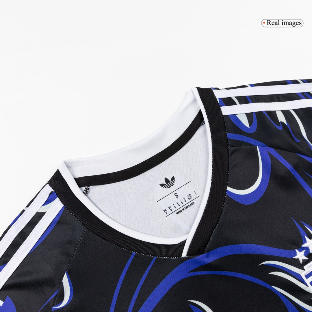 The Argentina Away Soccer Jersey World Cup 2026 redefines tradition with a predominantly black base, accented by white logos and sky blue details. This striking Argentina jersey features a vibrant, artistic pattern inspired by paintings, symbolizing creativity and national passion. It also proudly includes the classic Trefoil logo, making it the first modern-era Argentina football jersey to bring back this legendary emblem.