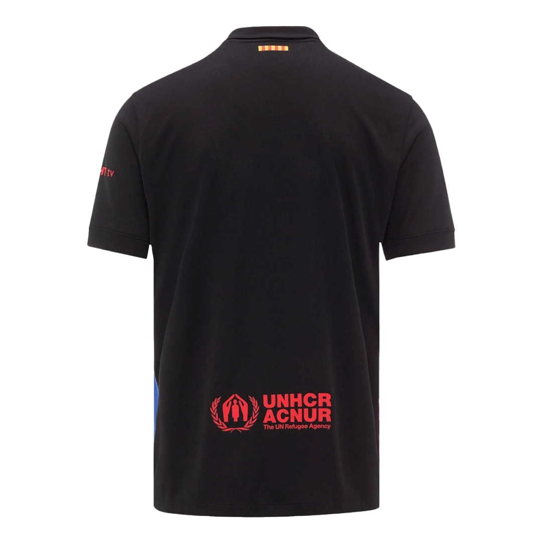 The Barcelona Jersey 2024-25 home is a classic design, complementing Catalan club’s signature black and blue and red stripes. The inner collar features the Barcelona 125th anniversary emblem in blue and garnet, with the Catalan flag on the reverse. Barcelona’s history of using the black Barcelona jersey dates back to the 2011/12 season when they debuted it as their third strip. That year, under Pep Guardiola, the team won the Copa del Rey and Spanish Super Cup, so it seems that the black Barcelona