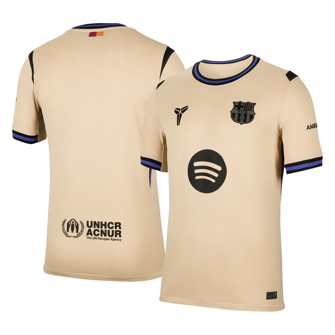 The Barcelona away jersey 2025/26 blends tradition with bold inspiration. This Barcelona jersey pays tribute to Kobe Bryant and the relentless Barça spirit. Featuring a unique Team Gold base with striking Black and Persian Violet accents, it's the ultimate fusion of football and legacy.