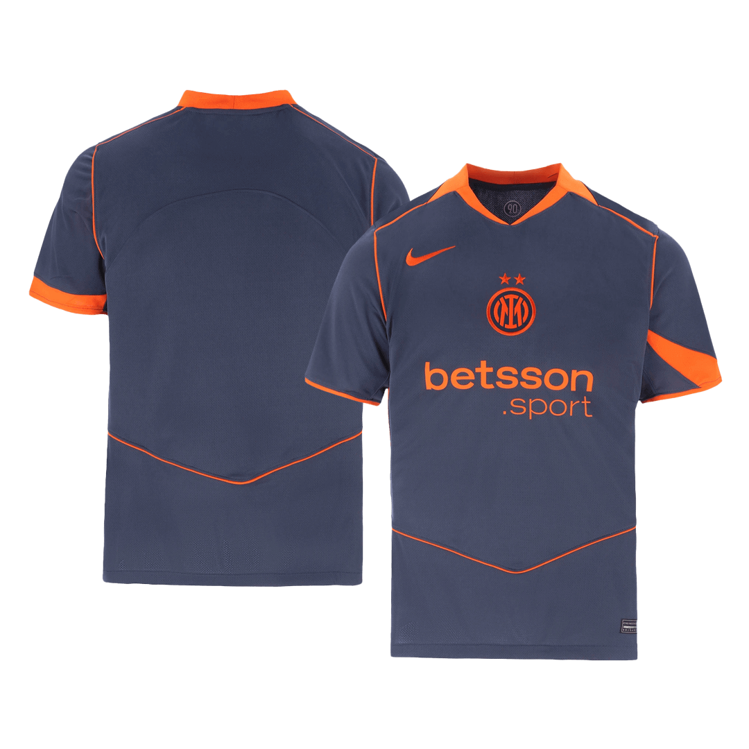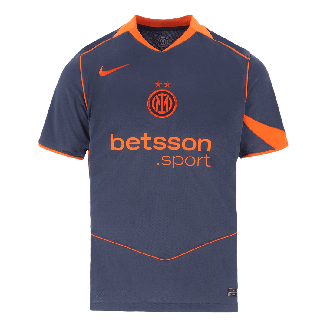 The Inter Milan third away Soccer Jersey 2025/26 is more than just a shirt – it's a perfect blend of tradition and innovation. Inspired by the legendary Nike Total 90 design of the mid-2000s, this kit brings back bold football fashion. The base comes in Thunder Blue (steel navy), highlighted with Safety Orange logos and detailing, creating a striking contrast that commands attention on and off the pitch.