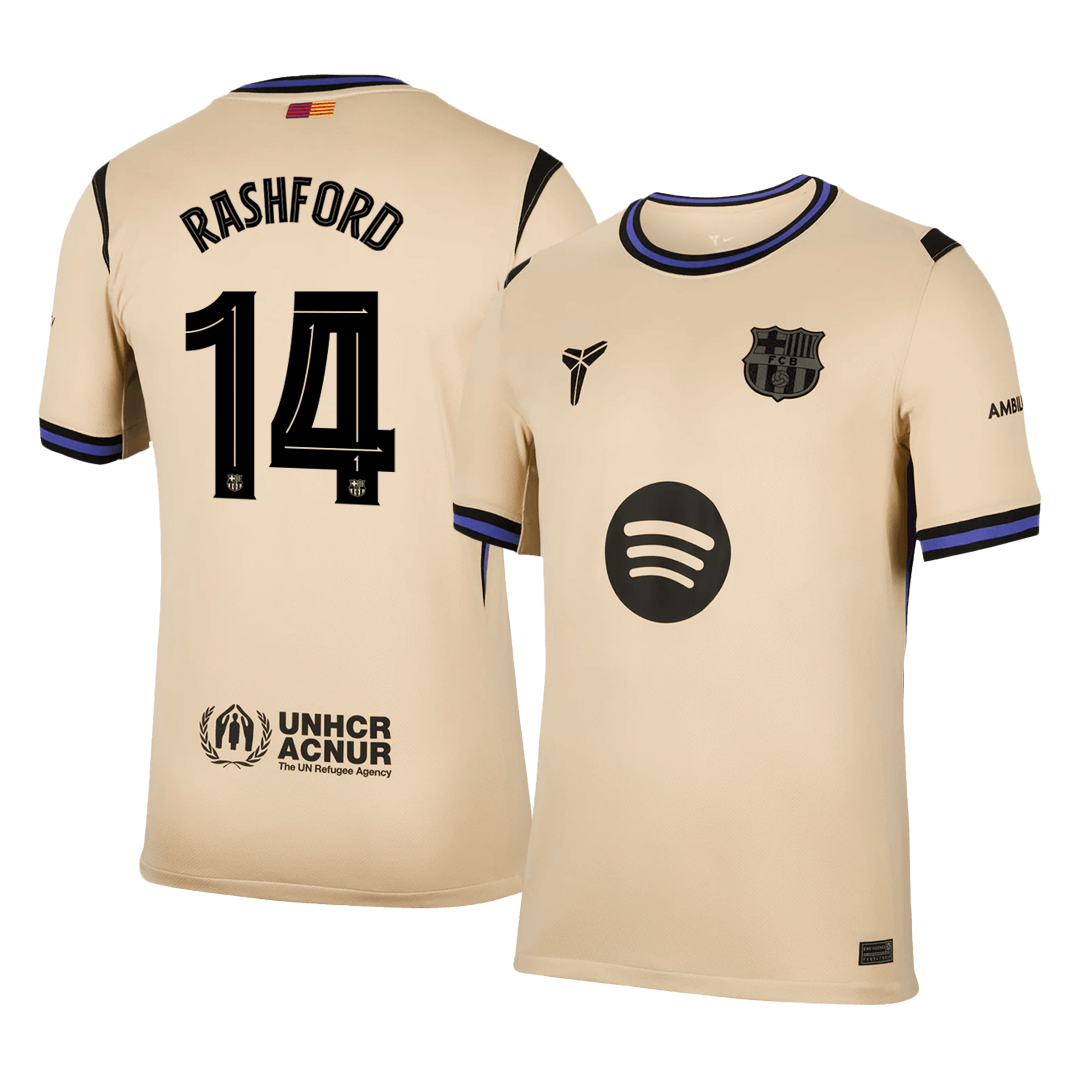 Unleash bold ambition with the RASHFORD #14 Barcelona away jersey 2025/26. This standout Barcelona football jersey is inspired by Kobe Bryant's Mamba spirit—where greatness is the only goal. Designed by Nike, the UCL edition features a striking Team Gold base, contrasted with Black and Persian Violet accents for a look that blends legacy and power.