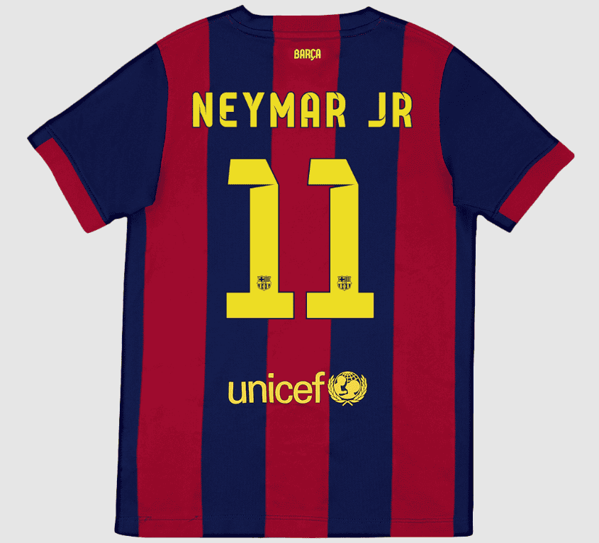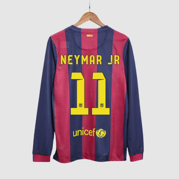 Vintage NEYMAR JR #11 Barcelona Jersey Home 2014/15 OUT NOW! The colors of the Barcelona jersey keeps their classic color scheme— Red and Blue. This retro Barcelona jersey holds a unforgettable memory of 2014/15 season for all the fans around the world.Neymar played an integral role alongside Lionel Messi and Luis Suarez in becoming La Liga’s most successful front three with an astonishing total of 122 goals by season’s end—a truly remarkable achievement. His exceptional goal-scoring ability throughout the season earned him a well-deserved second place behind Messi with an impressive tally of 39 goals across all competitions. Scoring in the Champions League final must have been a personal highlight for him; however, his brilliance was perhaps best showcased when he netted two crucial goals against Paris Saint-Germain in the quarter-final’s second leg or delivered a man-of-the-match performance against Atletico Madrid in Copa del Rey action.