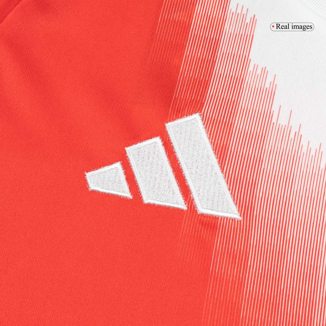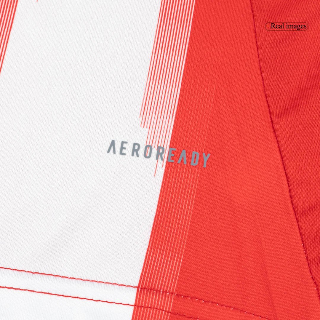 Crafted from the brand-new Adidas Tiro 25 template, this Bayern Munich jersey offers superior comfort and breathability on and off the pitch. The kit features a clean white collar embossed with "FC Bayern München," adding a unique touch for loyal supporters. Adidas uses white for all logos and details, while the iconic Bayern crest proudly remains in full color. Completing the look, the set includes classic red shorts and socks.